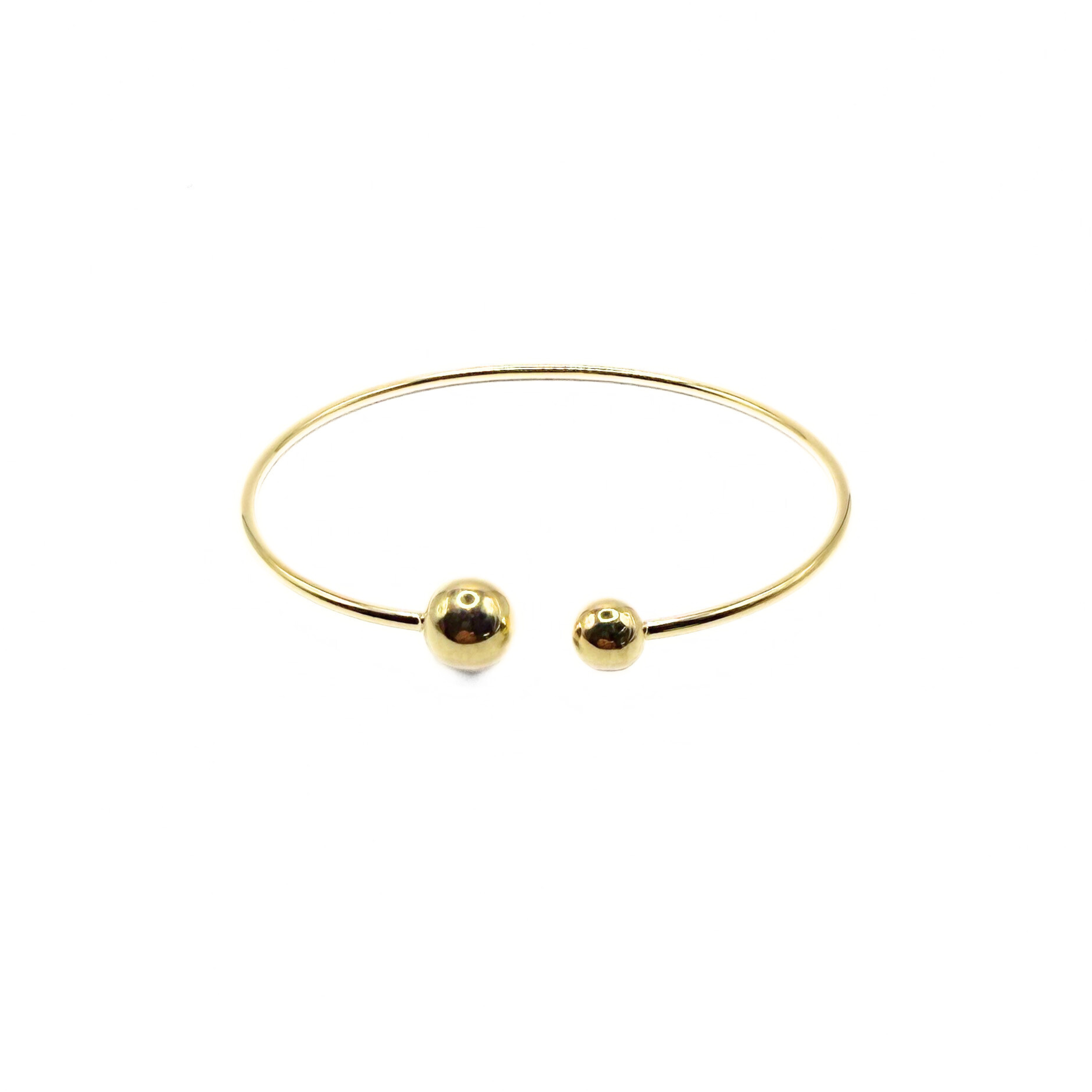 Sztywna bransoletka typu „bangle” o bardzo czystej formie. Wykonaliśmy ją ze srebra, które pokryliśmy grubą warstwą złota, żeby cieszyła oko przez długi czas. Na końcach daliśmy dwie gładkie kuleczki różnej wielkości. Jest lekka, prosta i świetnie wygląda noszona solo albo w zestawie z Twoimi ulubionymi bransoletkami.